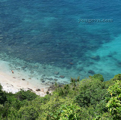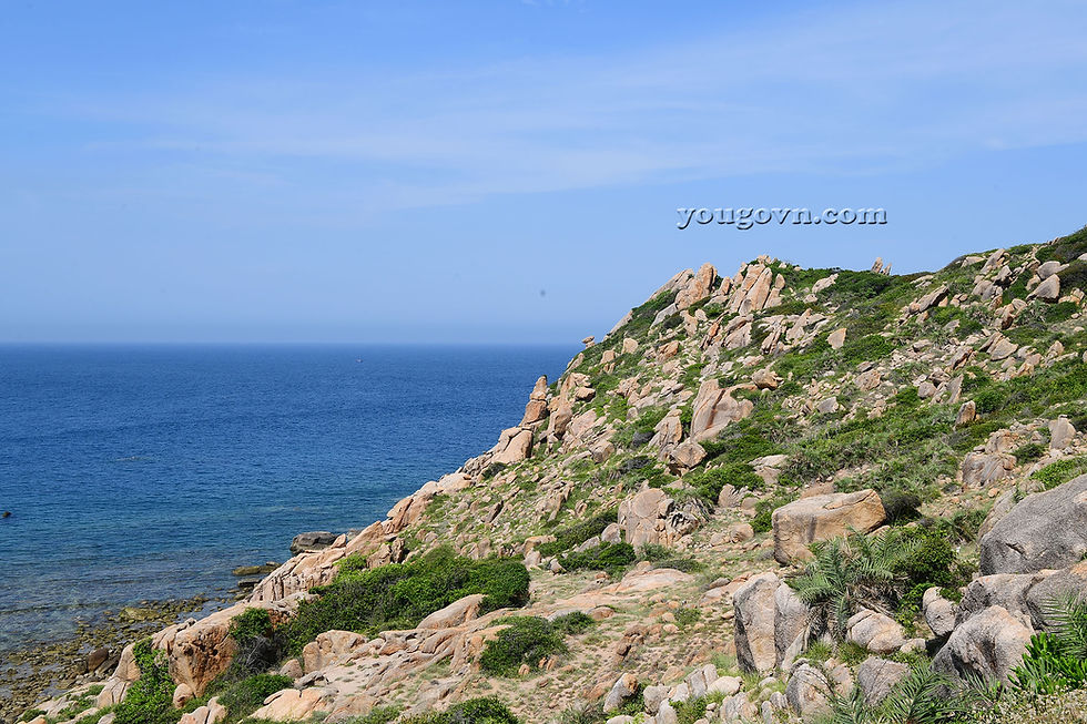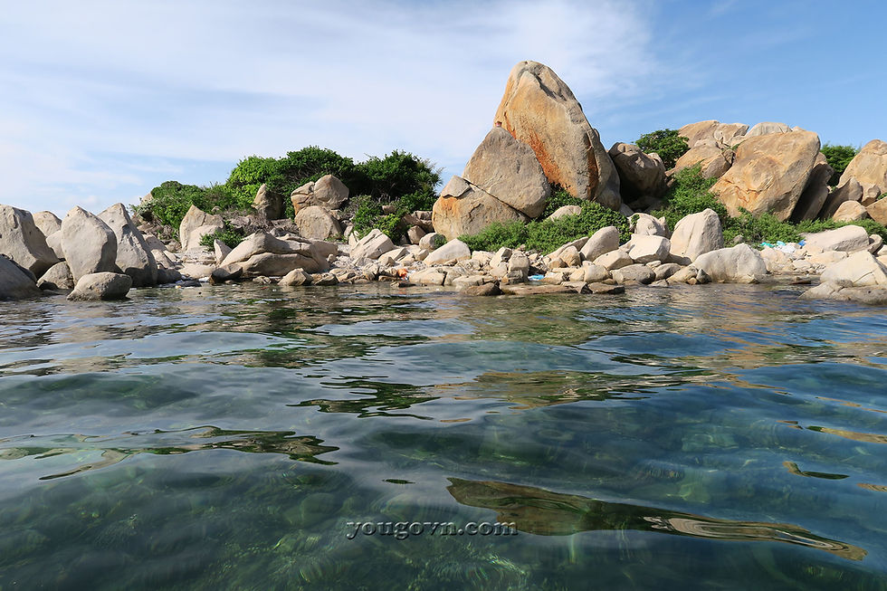 Ở đây, từ trên bờ biển có một dải đá chạy dài nối liền ra đảo nhỏ. Dưới làn nước gần như trong suốt có thể thấy rõ từng viên đá rất ấn tượng.