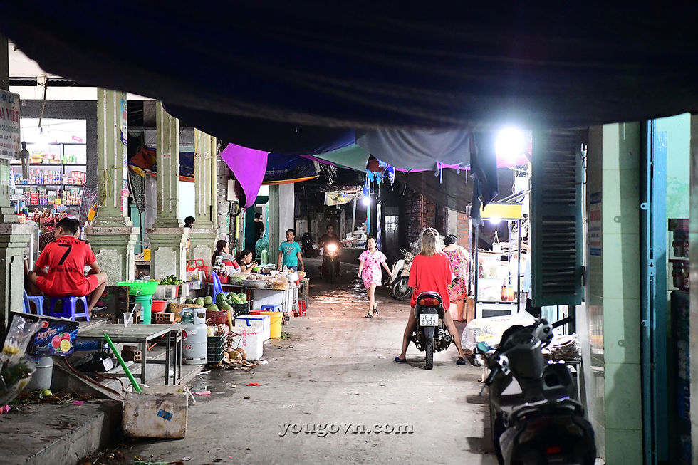 Khu vực cầu cảng ban đêm cũng nhộn nhịp với các hàng nước và hàng ốc. Những bè trên biển xung quanh cầu cảng thắp điện sáng trưng, dọc cả hành lang dẫn khách ra bè.