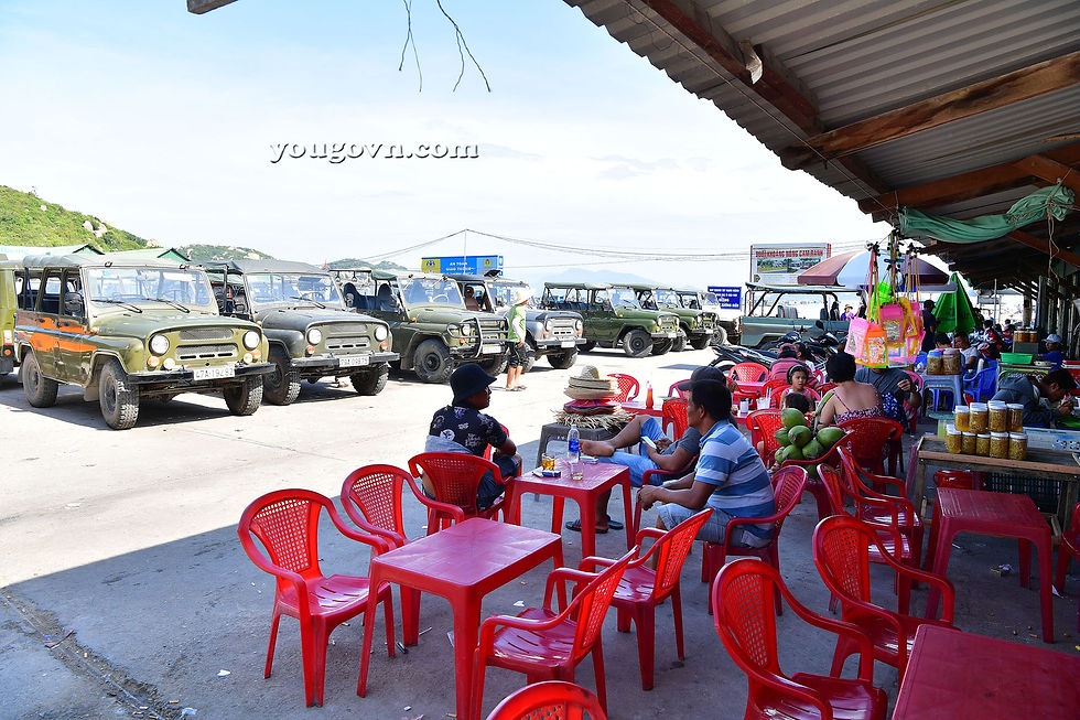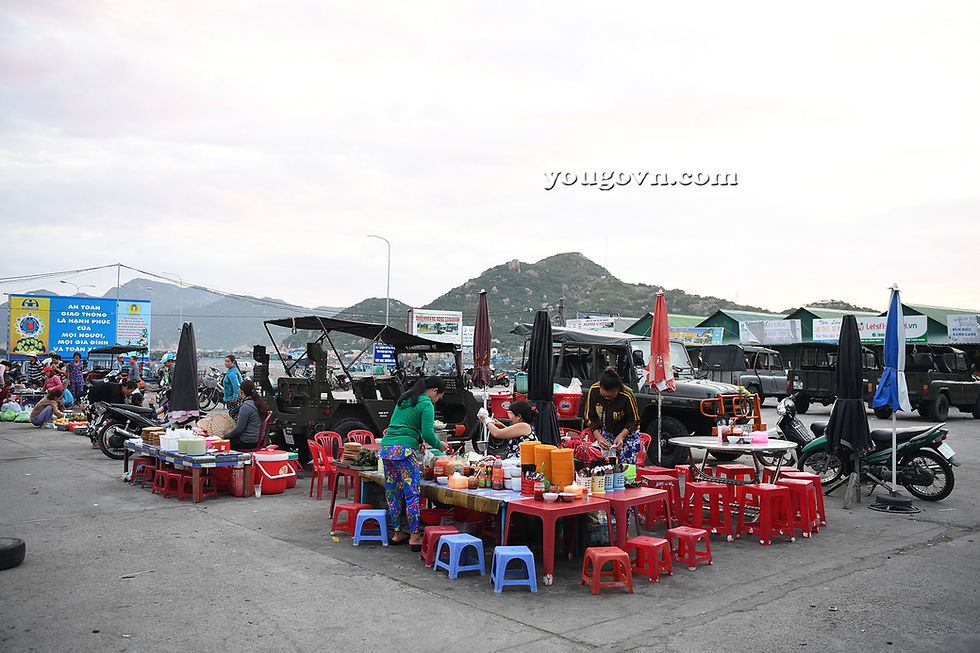 Sân cảng lúc này là những hàng bán ăn sáng. Những chiếc xe jeep bắt đầu xếp chỗ cho một ngày mới trên đảo.