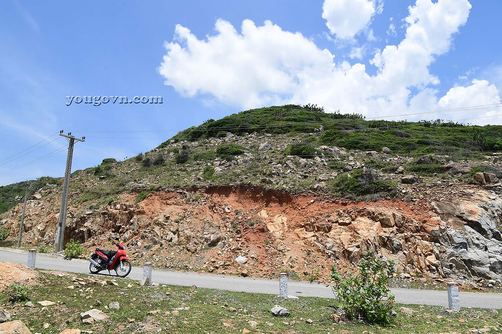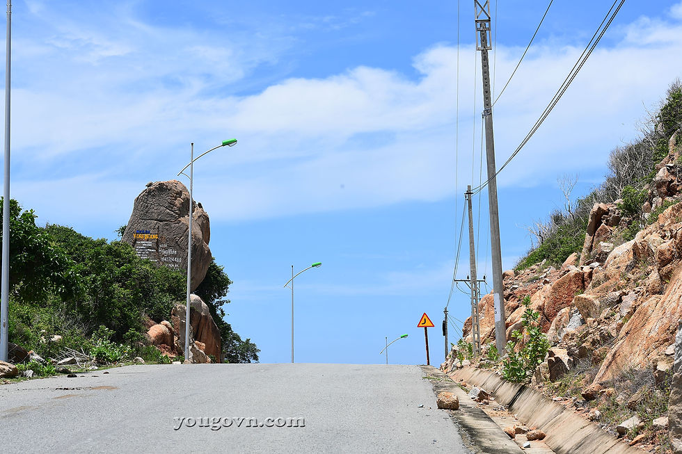 Điểm nhận dạng lối rẽ xuống bãi Đá Trứng chính là khi vừa lên hết dốc, bạn sẽ thấy cột mốc vệ đường cuối cùng bên tay phải, cách quãng là dải lan can bê tông chạy dài kéo đến tận cổng Hải Đăng. Phần cách quãng ấy chính là lối đi xuống bãi Đá Trứng.