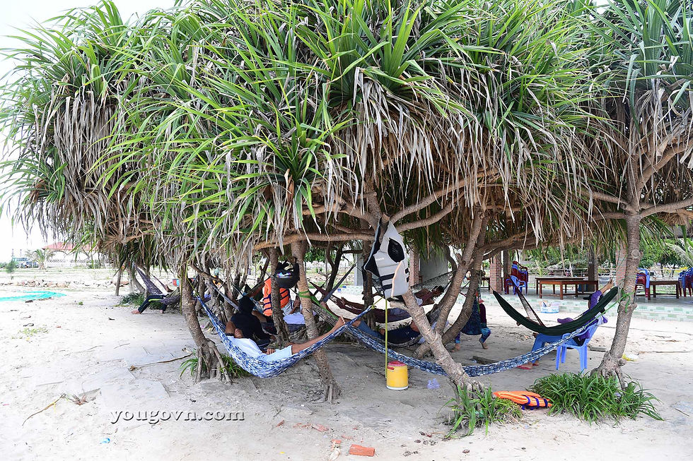 Lác đác trên bãi cát là những thân dứa dại cổ thụ được người dân mắc võng nghỉ trưa sau những buổi phục vụ khách du lịch.