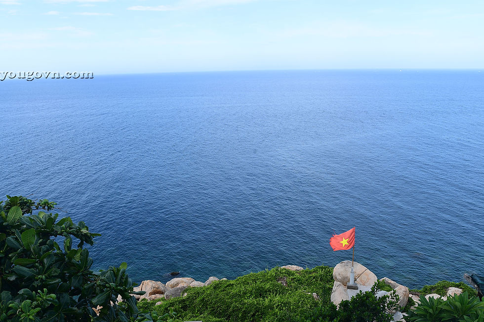 Phía tay trái của Hải Đăng hướng về Cam Ranh với những hòn đá đứng mong manh trên bờ vực. Phía xa là những con thuyền đang chờ khách lặn ngắm san hô.