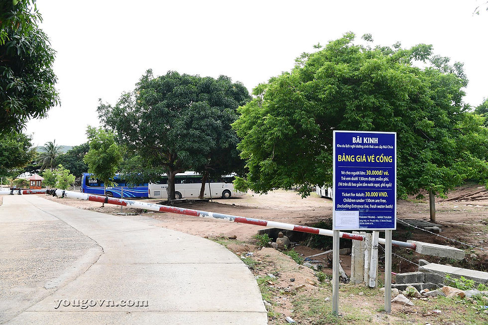 Đường rẽ xuống bãi Kinh từ đường 702 phải qua một cổng gác. Do lối đi này là của tư nhân nên họ thu phí mỗi lần là 30.000 vnđ cho một lượt khứ hồi vào ra (Nếu bạn có sang Vĩnh Hy hoặc hang Rái chơi rồi lại quay lại đảo ngay trong ngày thì cũng không thu thêm các lượt sau). Bảng giá vé cũng ghi rõ miễn phí cho người dân đảo, cán bộ công chức, giáo viên đi công tác hoặc các cá nhân tổ chức giao thương mua bán với bên đảo Bình Hưng.