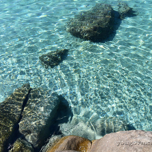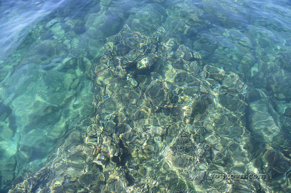 Ấn tượng đầu tiên khi đến bãi Bà Bóng đó là mặt biển như pha lê với những tia sáng như tổ ong lấp lánh dưới đáy trải dài khắp mọi nơi.