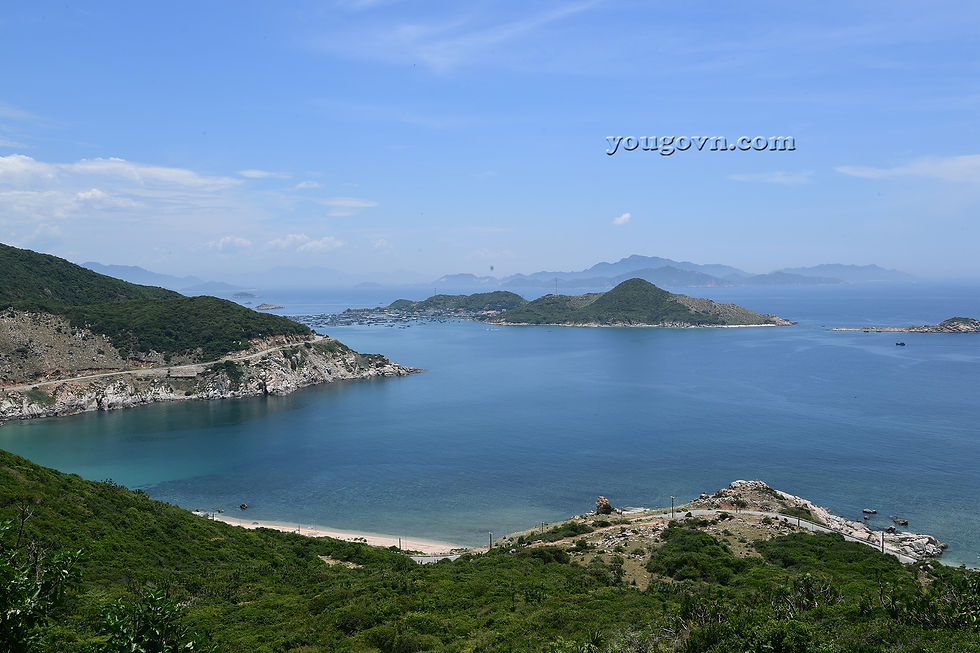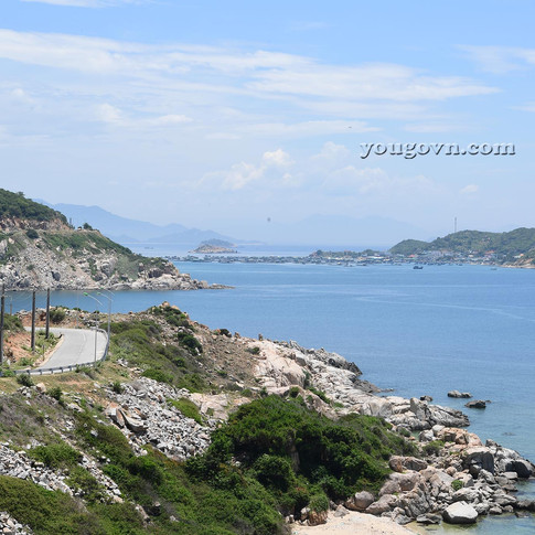 Khi vượt sang tầng đèo thứ 2 để sang hẳn Vĩnh Hy cũng là lúc bạn sẽ được ngắm biển trời núi non hùng vĩ nhất của tuyến đường. Đảo Bình Hưng sẽ khuất dần ở phía xa bên tay trái.