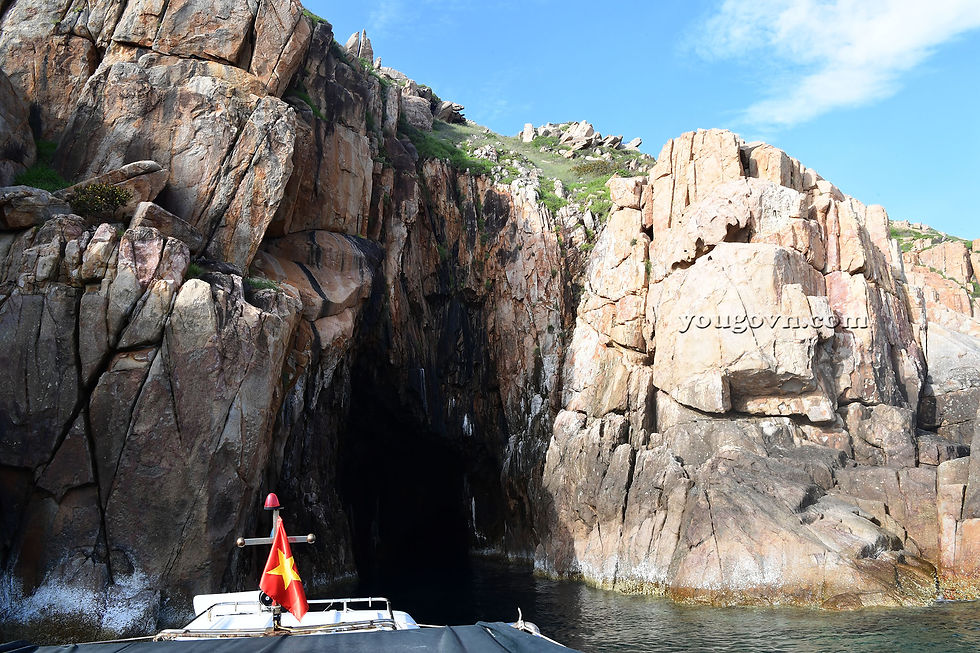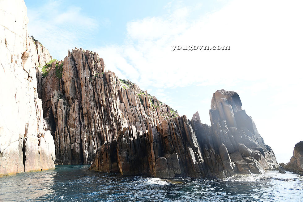 Rời Hang sâu Tình Yêu, thuyền sẽ vòng một vòng cung để ra mặt sau của hòn đảo này nơi có vách đá dựng như một bức tường thành.