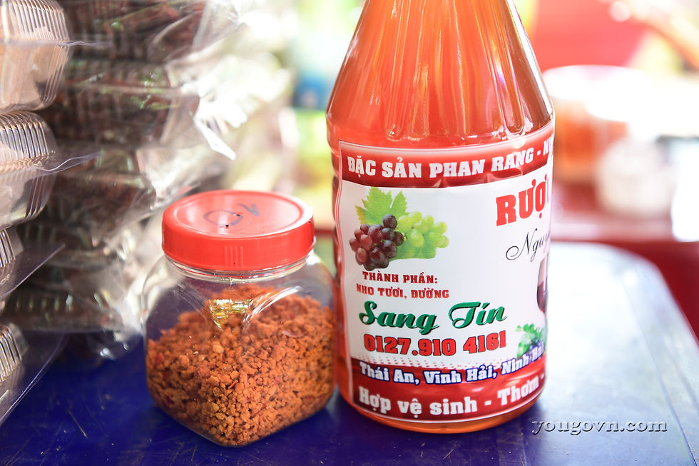 Hai sản phẩm mà bạn sẽ được mời thưởng thức đó là rượu nho và mật nho. Nếu để so sánh rượu nho ở Phan Rang với rượu vang thì rất khác. Rượu nho nơi này không cầu kỳ, kiểu cách nhưng vị ngon rất riêng biệt có lẽ bởi không dùng men mà chỉ để phân hủy tự nhiên và hòa quyện với đường trong quá trình ủ.