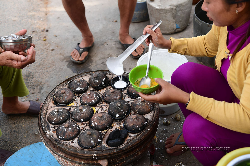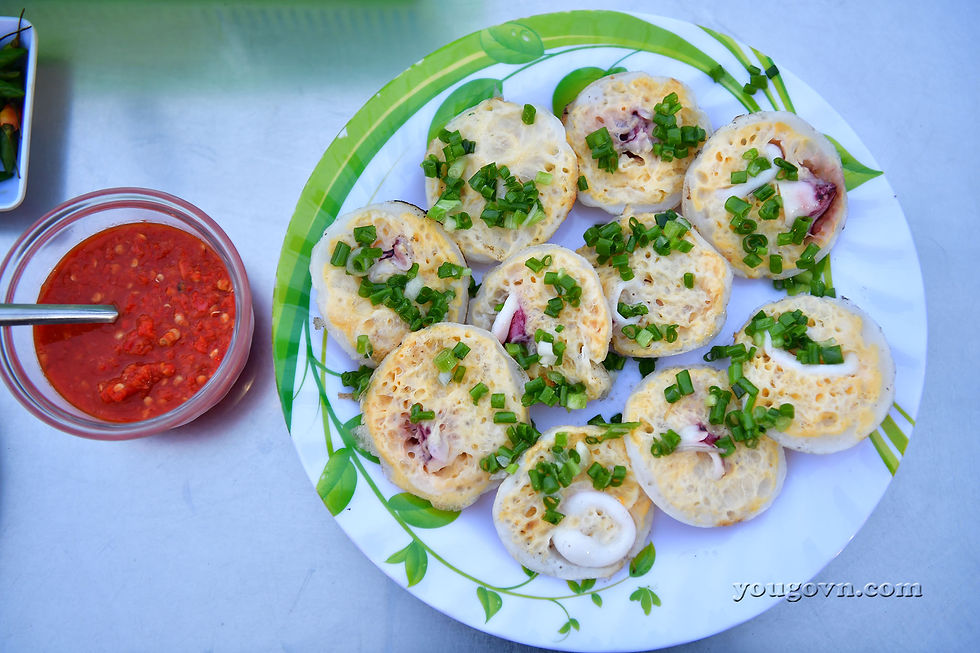 Những chiếc bánh nhỏ như nắp ấm tích rất xinh xắn được tráng trên những chiếc chảo gốm mini có thể có nhân bằng trứng, bằng tôm, bằng mực hoặc cả những con cá tép biển.
