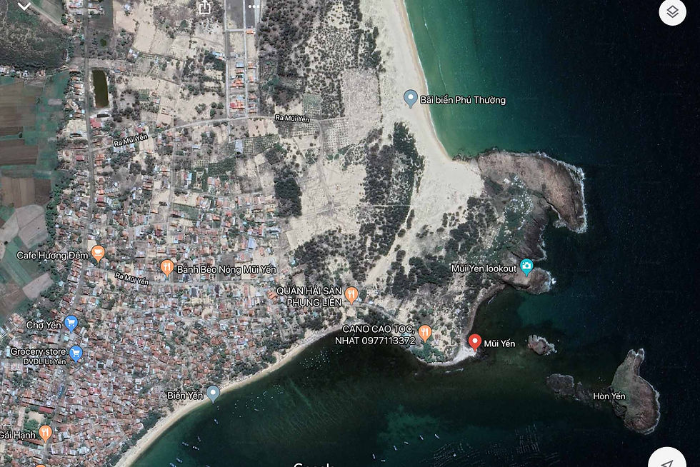 Bạn đi xuống hẳn bãi đá dưới Mũi Yến nhìn sang bên tay phải bạn sẽ thấy bãi Xép và Gành Ông, xa xa là núi Chóp Chài của Tuy Hòa.