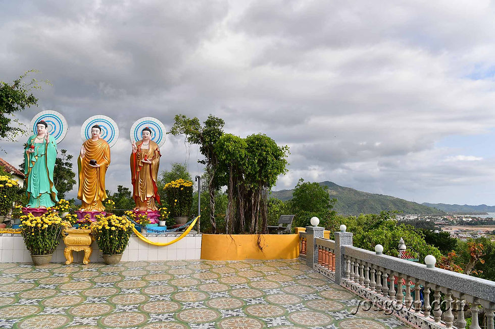 Càng xuống dưới phía chân dốc khi tầm nhìn Vịnh đã khuất bạn sẽ thấy bức tượng lớn của chùa Phước Quang phía bên kia đường tránh trên đỉnh đồi.