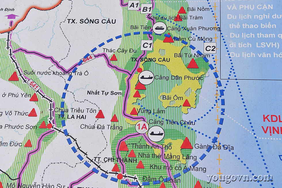 Còn nếu bạn đi theo các đường liên thôn dọc theo bờ biển để qua các điểm thắng cảnh rồi xuyên qua cầu gỗ Ông Cọp lên quốc lộ sang phía Sông Cầu thì khung cảnh càng trở nên yên tĩnh và rất thanh bình.